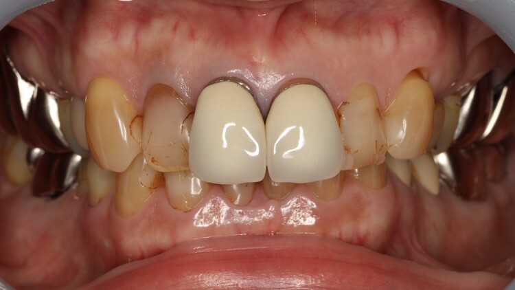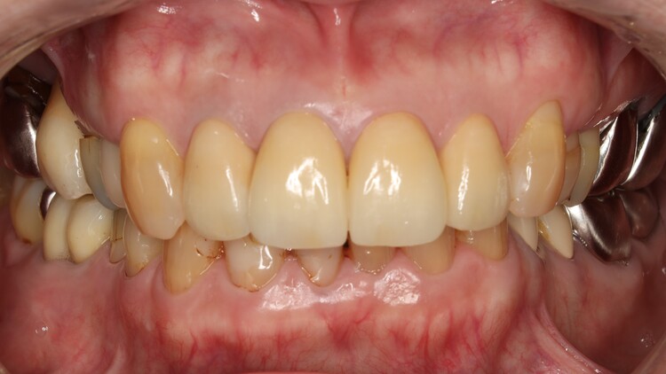 左右の犬歯の色を参考に、前歯4本に自然な歯の色のかぶせ物(ジルコニアセラミッククラウン)を装着する治療を行いました。