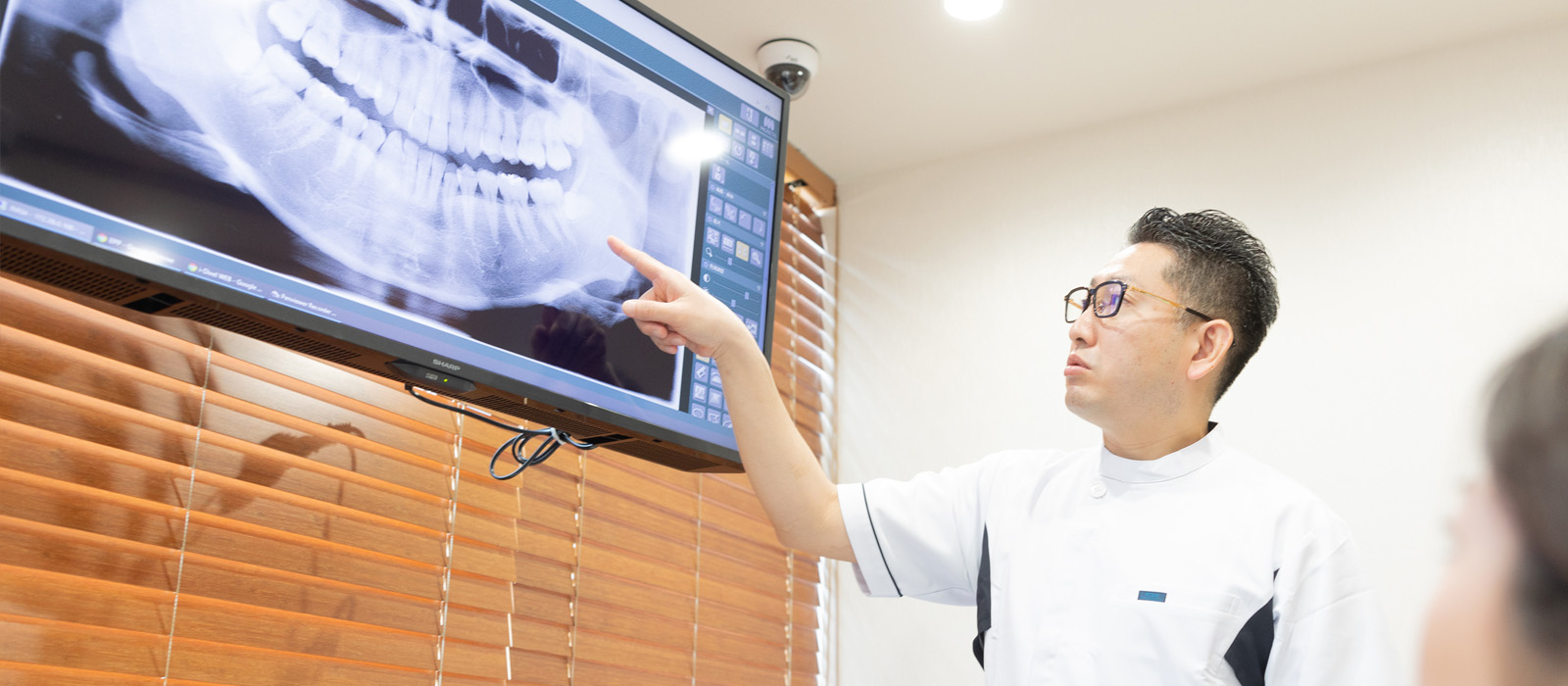 口腔内カメラで撮影したお口の中のお写真や、CT・レントゲンのデータなどを大きな画面に映して一つ一つ丁寧にご説明を致しております。